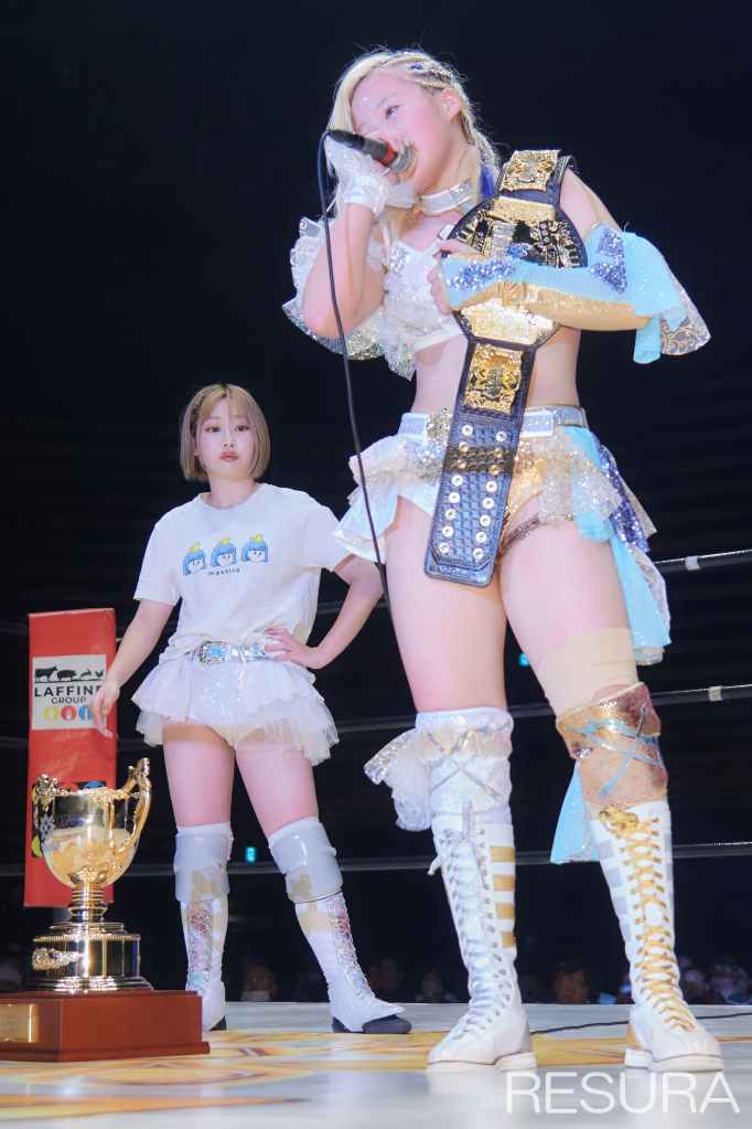 It was a high-energy opening match, and they made good use of both Flying Penguin and Marigold’s own singer, Naho Yamada, by having them do their full entrances as the first and second entrants. There were some clever Ice Ribbon callbacks, and old AWG stablemates Misa Matsui and Naho even teamed up at times. Hanazono was bubble-filled chaos, as expected. NightShade had some good monster spots, and Hummingbird did some neat lucha. Yuuki Mashiro won the Rumble when she eliminated Yuuki Minami. The full list of participants was: Naho Yamada, Flying Penguin, Rea Seto, Misa Matsui, Hummingbird, Ryoko Sakimura, Yuuki Minami, Nagisa Tachibana, Yuuki Mashiro, Hamuko Hoshi, Riara, NightShade, and Momoka Hanazono.