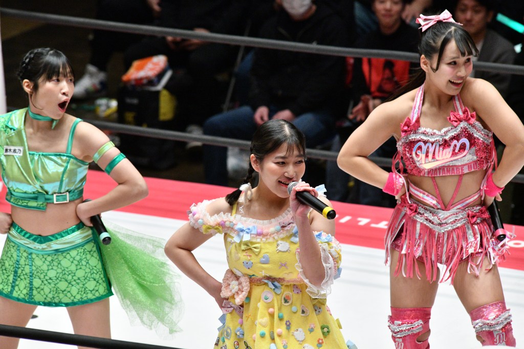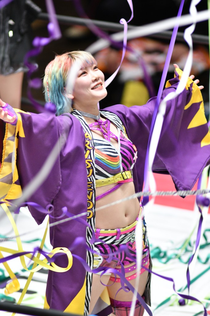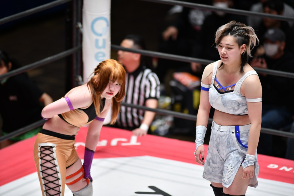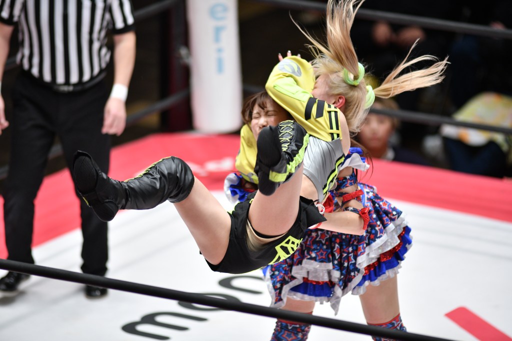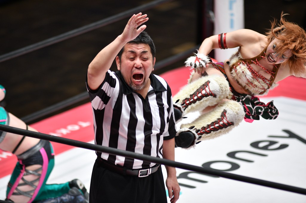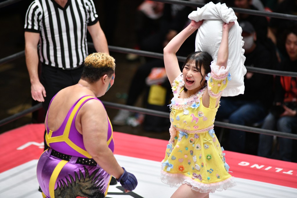 Raku on big shows has found a nice place with her usual shenanigans and this match featured some talent that works really well in this universe. AEW’s Bryce Remsburg was a good straight man to all the comedy as was Kong. Raku not backing down to Kong was a good continuation to the storyline from Hype! Pom and Neko had some time to shine while Yuki got to be a powerhouse. Mahiro was the unfortunate target of so much of their antics and that continued in the next match as well. Yuki landed the Venus DDT on Neko to get the three-count.