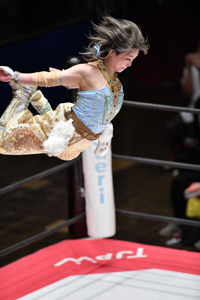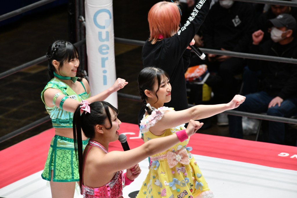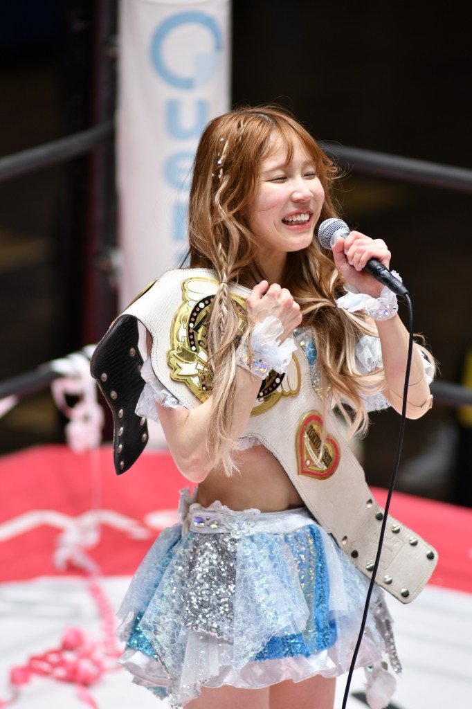 The show began with the Up Up Girls (sans Uta) performing a new song “Stand Up! Proof Of Love”. It’s worth noting Hyper Misao was out to announce she had written the lyrics to the song and then sat ringside to cheer the group on.