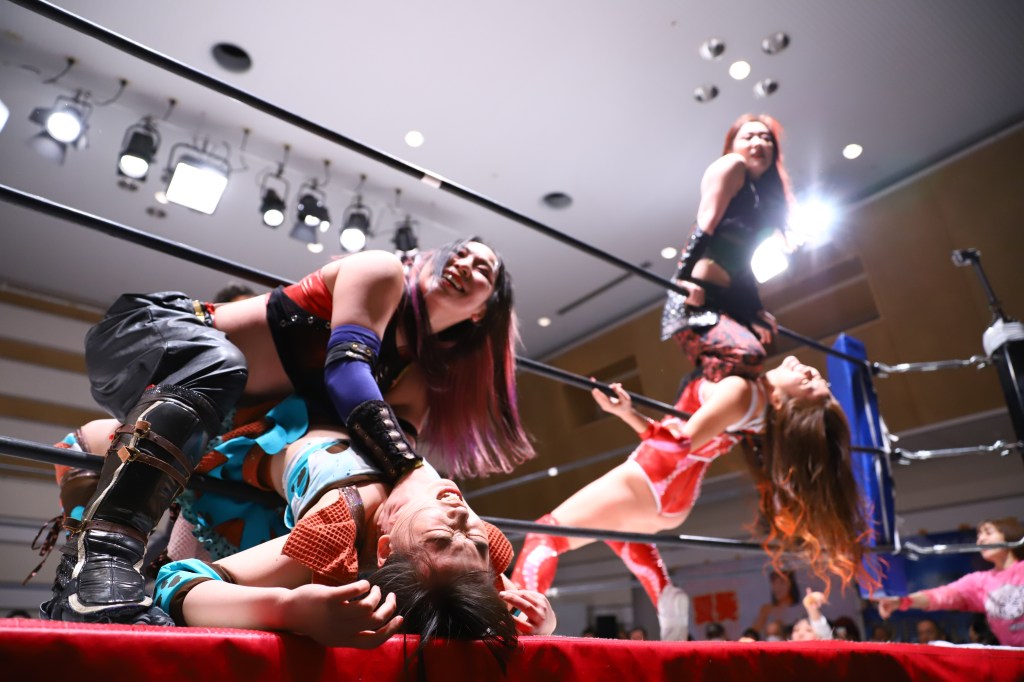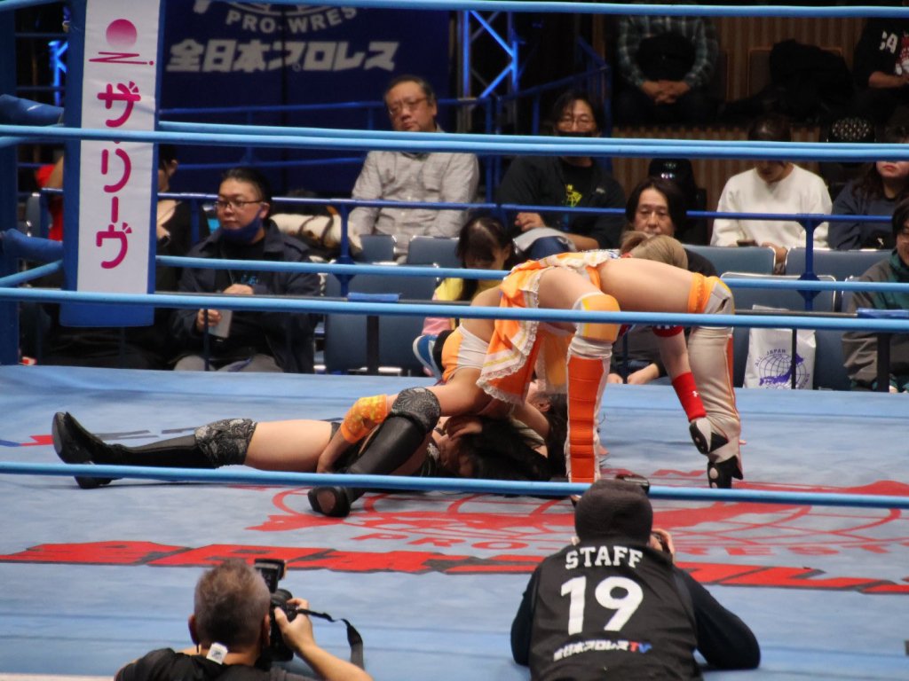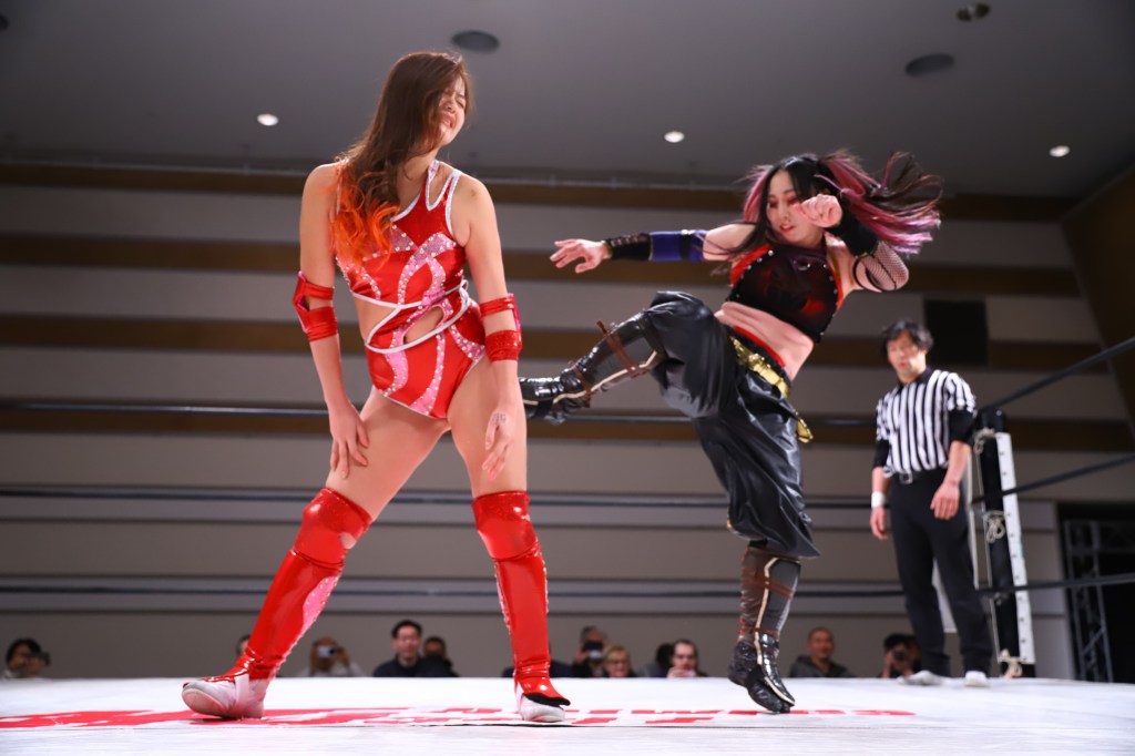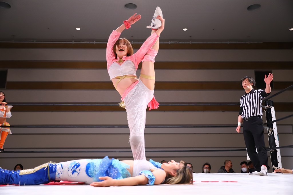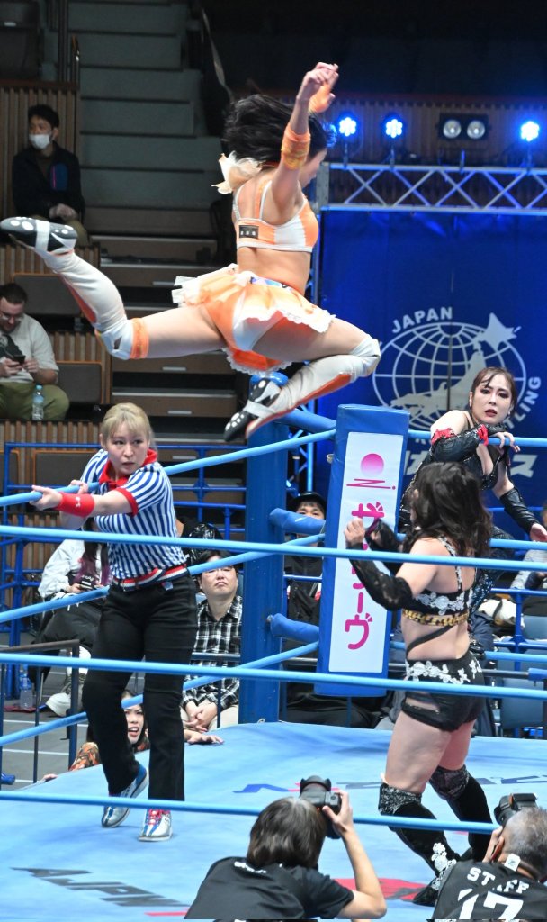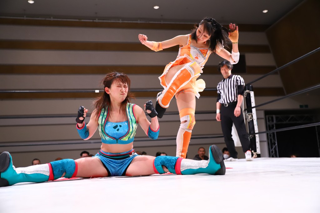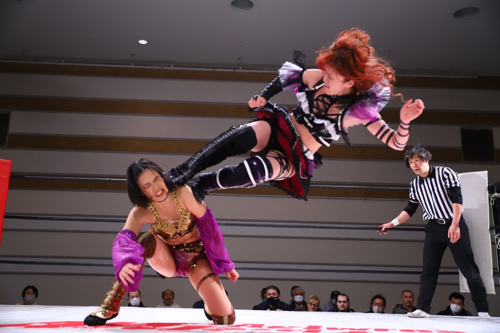 Ayano is the smooth and confident veteran who fits anywhere on the card. After a few minutes, Ayano puts Hinata down with the vertical sit-out facebuster for the win. Afterwards, she helped Hinata to her feet.