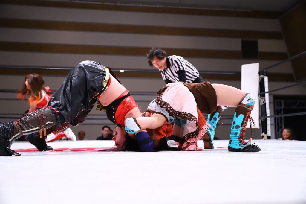 A really nice showcase of what AWG is all about in front of over 2,500 people. The Love Riddle kicked things off before transitioning into the tag match. Worth noting this was a one-off reunion of BE∀STZ REBELLION as Riko put back on her black gear to team up with ACT. Early on, Natsuki and Marino got ACT in the corner, and the entire crew did the train spot of charging ACT; this included ring announcer Yumi Agawa and referee Banny Oikawa. The spot was really fun and grabbed the attention of the people in attendance. While under 10 minutes, they squeezed in a lot of important signature moves, such as Natsuki’s Halo Hold submission, Riko got to show off her Tiger Suplex, and Marino took ACT out of the match with the MRN Smash! German suplex.