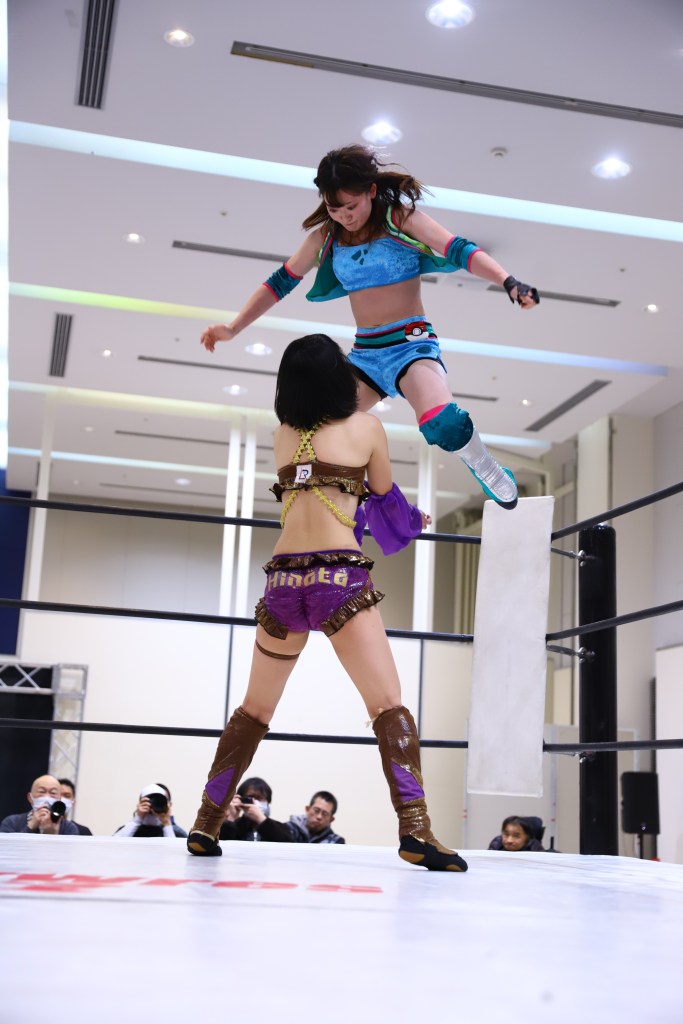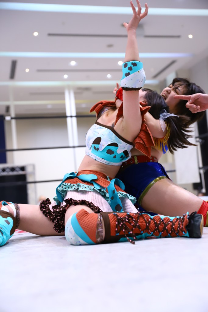 ANRI hit her seated senton off the second rope (which is fittingly called 100,000 volts) to pin Hinata.