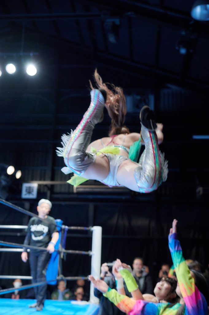 Hanazono and Mashiro had an eye poke battle, and that was just the kind of action you would expect from those two. Hanazono was eventually turned on by her partner, who did a moonsault onto her, followed by Honoka and Mashiro piling on to get the pin.
