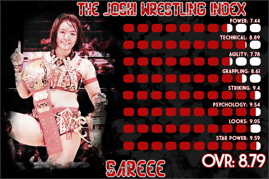 Honestly, power might be one of her lowest grades, but it’s not because she’s not strong, or very physical. Sareee has the ability to lift just about any fellow joshi wrestler she’s in the ring with other than the super heavyweights. She has enough strength to do her throws, but she doesn’t use a lot of power-based moves, so that stunts her rating a bit lower than someone who is known for power.