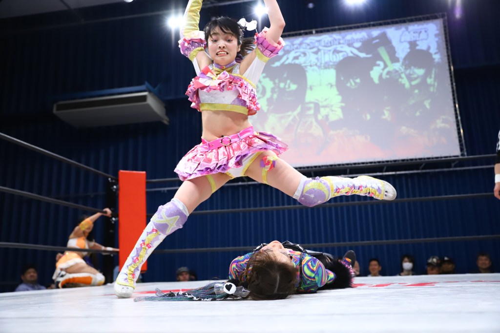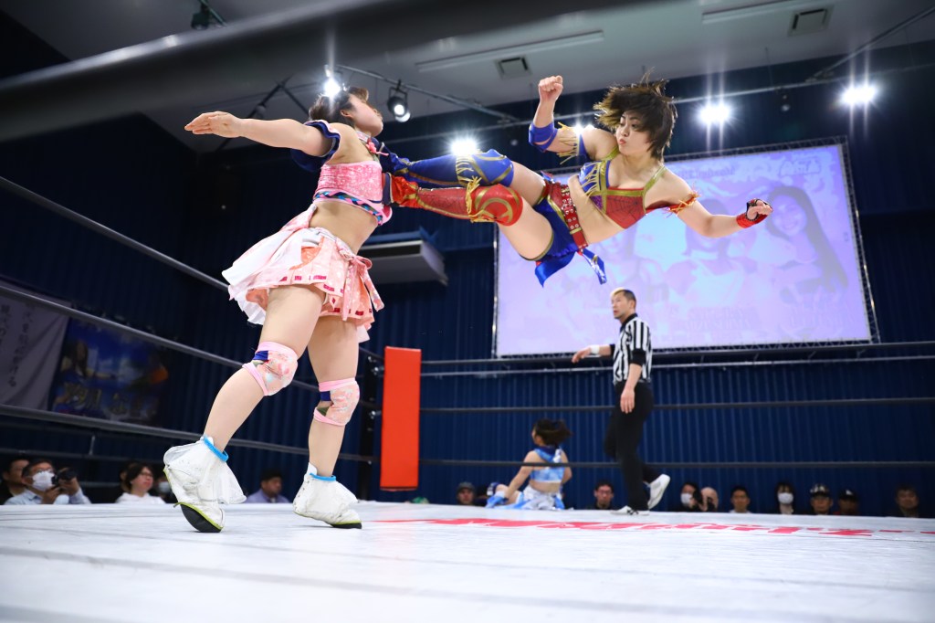 Asako wanted to start and scared Ayano by streaming and changing directions while running the ropes. The ever-inventive Asako then gets a near fall with a music distraction, further adding to her resume of unpredictability.
