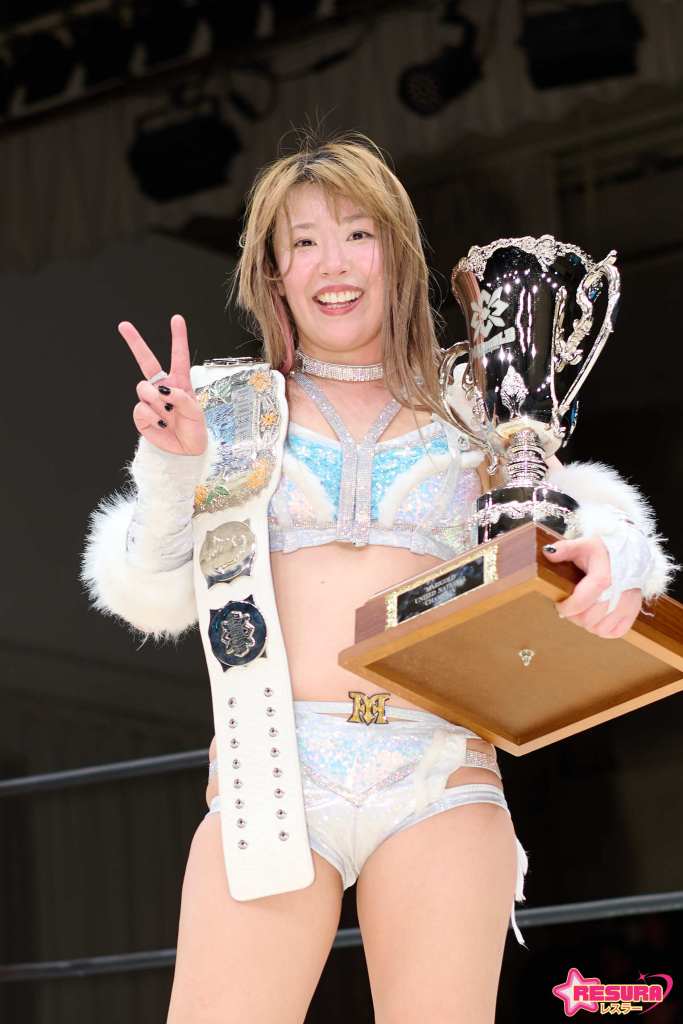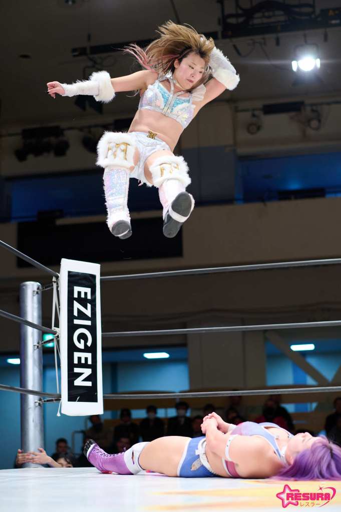 Seri faced off against Yuzuki; these two young champions are likely going to play big parts in Marigold’s future. Seri plays to her strengths with amateur-based offense. Utami and Nanae knocked each other around with huge strikes; Utami and Yuzuki worked well together. Yuzuki dove to the floor and back in the ring; a dropkick into a German suplex further cemented the chemistry of the challengers. Exhaustion was setting with Yuzuki and Seri which is to be expected, one big German suplex into a clutch pin and Seri pinned Yuzuki to retain the Twin Star Titles.