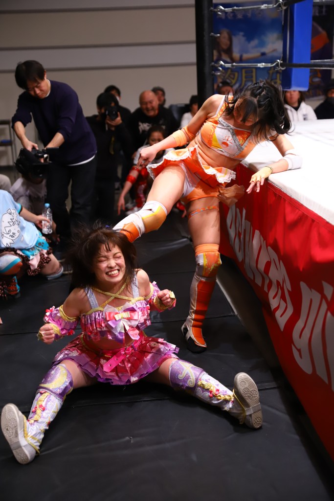 Yui physically moves Mizushima to the corner as she wants to start the match against Mari. Yui is a very good over confident and slightly delusional challenger who thinks she will have no problem beating Mari for the KING Of Entertainment Title.