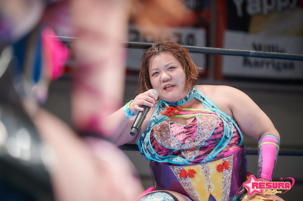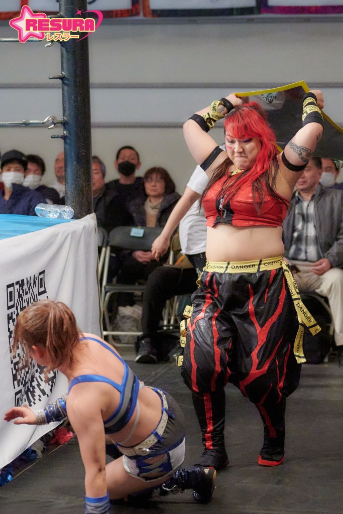 Yappy is a very good heel who uses her size and strength advantage but also resorts to pummeling opponents with weapons such as the road sign she carries to the ring. In reality, Yappy is one of the most beloved figures in all of joshi and is an integral part of Ice Ribbon in the ring and behind the scenes.