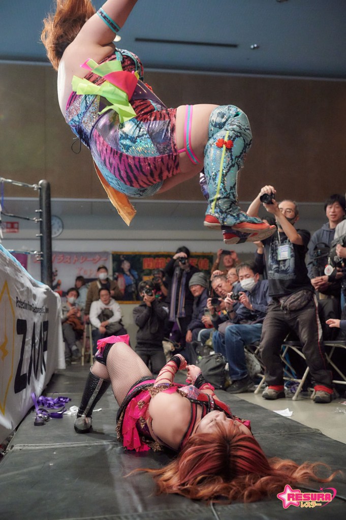 Kaho returned for this show to team with Shimizu in one last match before her retirement in March. The match began with everyone taking turns hitting Shimizu in the corner, with Hamuko ending it with a kiss.