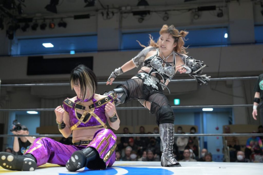 Saran right away was stomping the feet and hands of the champ, Honoka. They had a nice back and forth and showed they are both very promising young players in Joshi. Both are well-rounded with submissions and technical moves. Honoka was favoring missile dropkicks to keep the advantage in this match. Saran started unloading a lot of moves and hit a double foot stomp off the top rope; Honoka got her hand on the rope. The champion caught Saran with a flash crucifix pin.