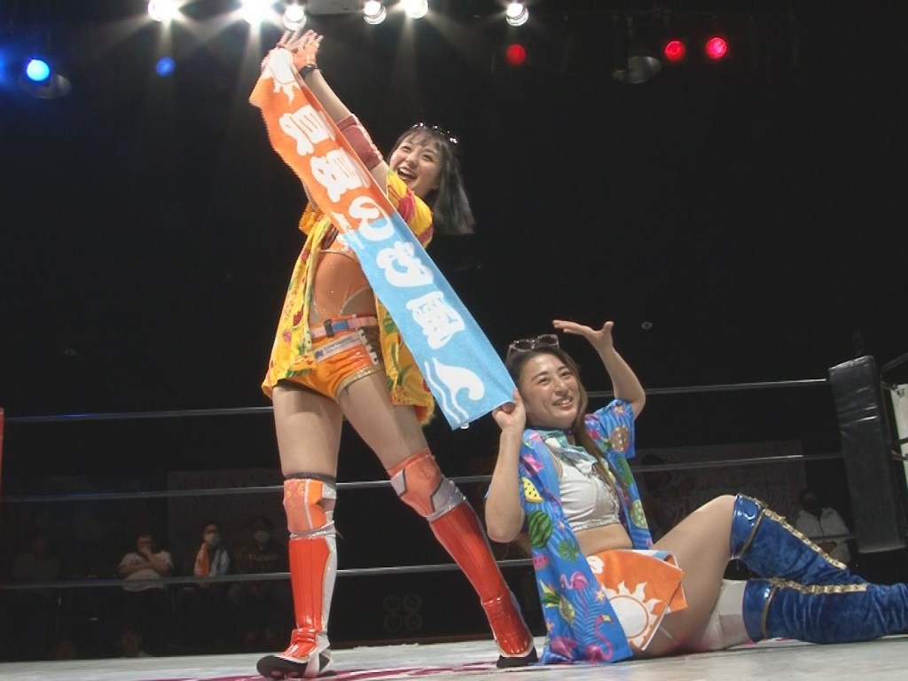 Fantastic tag match and a great way for Natsuki to follow up the Korakuen Hall main event title match. With the Act Games underway, Nagisa could really benefit from a sustained run with Natsuki as Midsummer Sea Breeze. The duo are a classic babyface team high-fiving the crowd during their entrance in the manner of 1980s tag teams like Strike Force (tropical shirts in lieu of shiny jackets).
