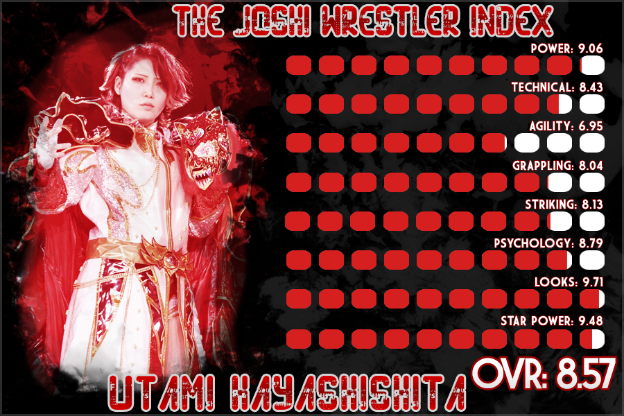 The technical skill is one that is broken down into two parts, and Utami is very good at both of those parts. Not only does she do her moves cleanly, but she’s also very well versed in many suplex variations, with the “German Suplex” being her specialty. There’s no doubt that Utami’s strong judo base has helped mold her style to what it is today, and it has definitely helped her become one of the best technical wrestlers with the definition at which we rate them. Once again while I do think she’s great, there are a few wrestlers who I’d probably put above her in this category, which is why she’s not getting that full ten rating.