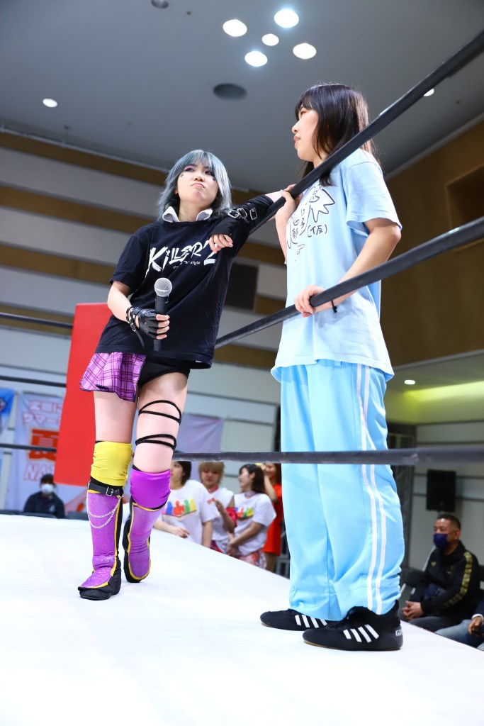 Togi is still at the crossroads of being one of the good guys or joining up with her theater mentor, MARU, in Killer’Z. It’s a tough call, as she is very good at both; she can be the undersized babyface or the frustrated heel trying to please her seniors. Naru made quick work of Togi and beat her with the always impressive missile dropkick. Naru is really good but could be great with a few more big performances.