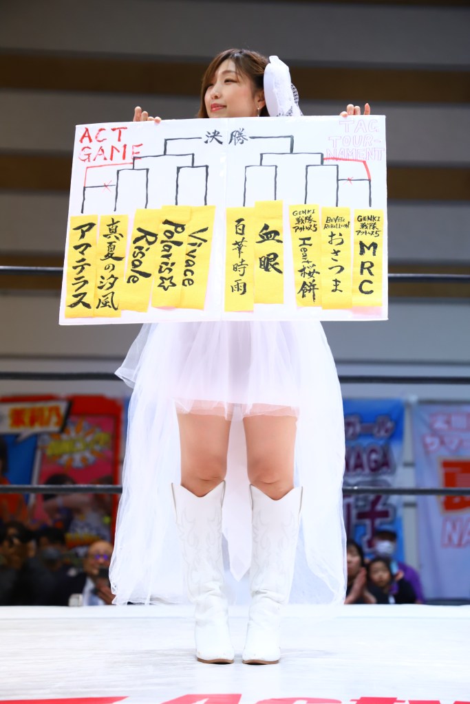 A late addition to the tournament, but welcome nonetheless. Chii was disqualified early on when she was teaming with Asako. It’s good news that she found a way back; Chii needs to be in the mix to avoid being stagnant. If everyone else around her were participating and she was on the sidelines, she would have surely fallen behind; the same can be said for Togi, who has a tough decision ahead. The outcome of their match might decide which side Togi chooses. Whether she is a heel or babyface, her day has just begun and her tale is unfolding.