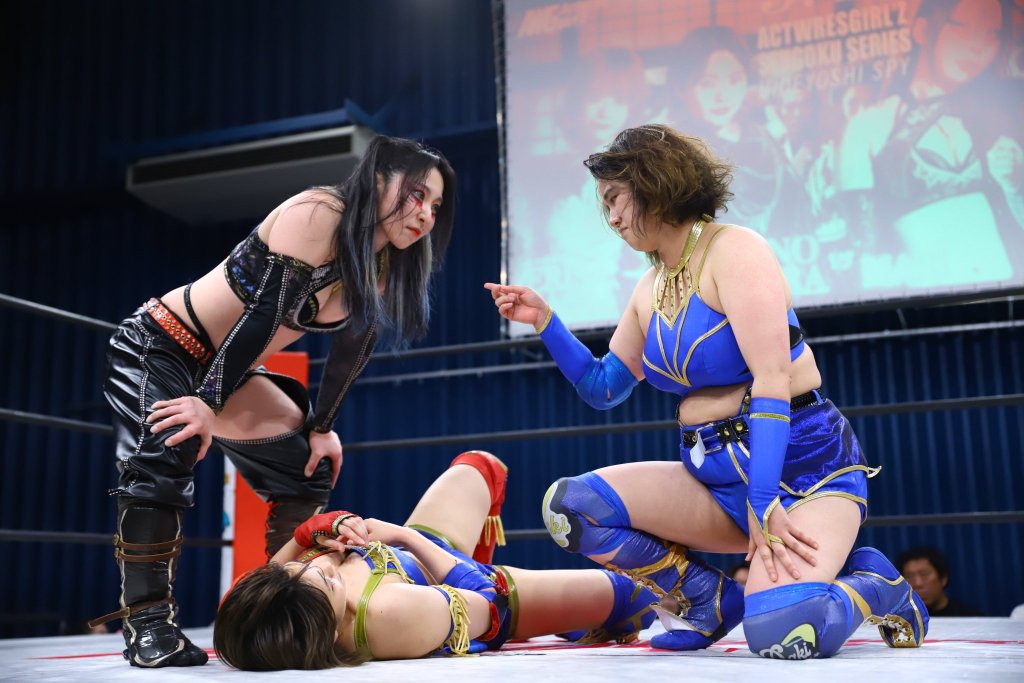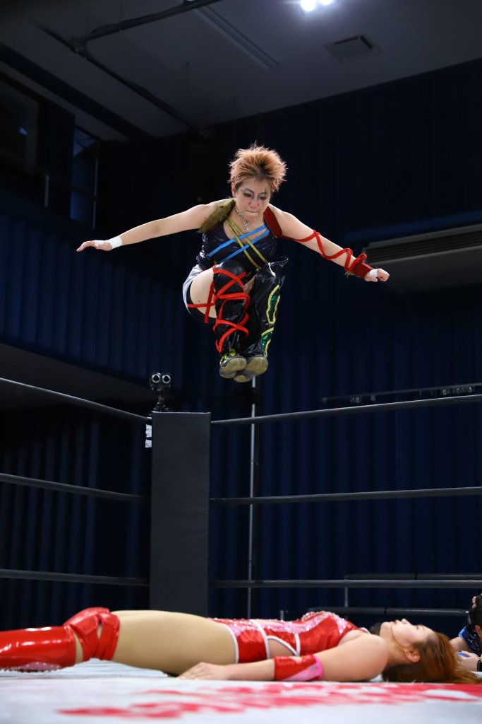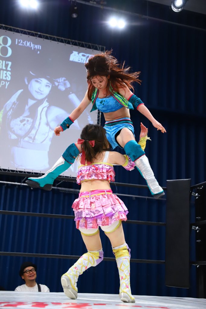 ACT and Maru utilized stretch mufflers and did so relentlessly. Uehara is putting together a nice set of moves; she will have a big spotlight on her at the end of the month when she tags with Natsuki at the Natsu Saory produce show. Maru puts an end to the match with a double foot stomp off the top rope. She held out her middle fingers to add insult to injury.