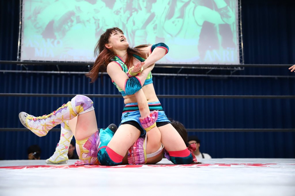 ANRI wasn’t going to have an easy day going against Asako. Even though this is her more grounded persona, she still is an enigma to her opponents, the audience, and likely herself. ANRI tried multiple submissions but had better luck with her assassin-like kicking. Asako attempted some variations of water wheel-style kicks but perhaps doesn’t yet have ANRI’s precision.
