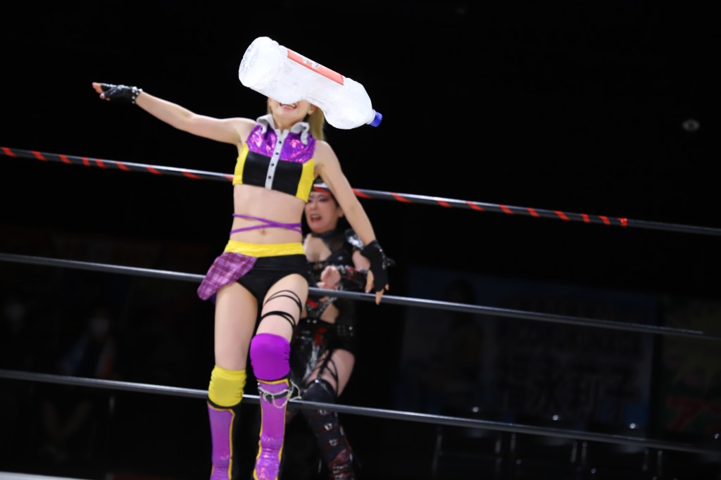 Natsuki and Yukina were against Kyoka and Togi, while ACT was up to no good and was blasting everyone in sight with her sake bottle. A really fun match that was a good combination of comedy and hard-hitting action.