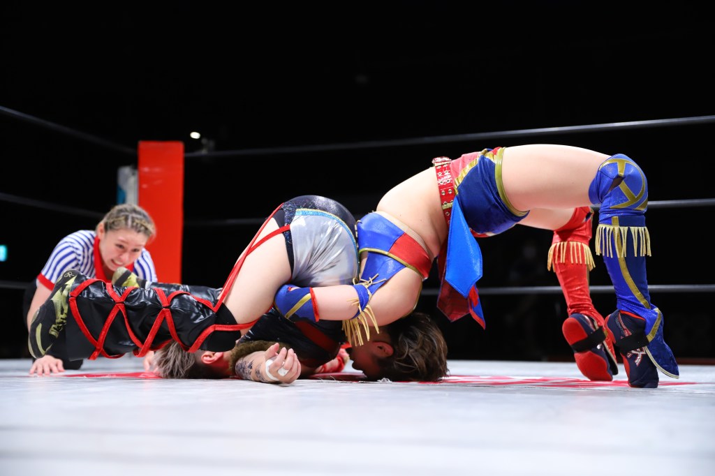 This was a fairly one-sided fight and will be something that Polaris☆ builds off as they keep adding tandem moves and continue to figure out what works best for them as a unit. ANRI with her kickboxing skills (which would be at home in Lidet/UWF) and Erisa’s unwavering tenacity are good base coats for a growing tag division. Ayano was especially vicious in this fight and had ANRI beat with Teardrop Angel but opted for a straight jacket-style Camel Clutch to get the tap-out win.