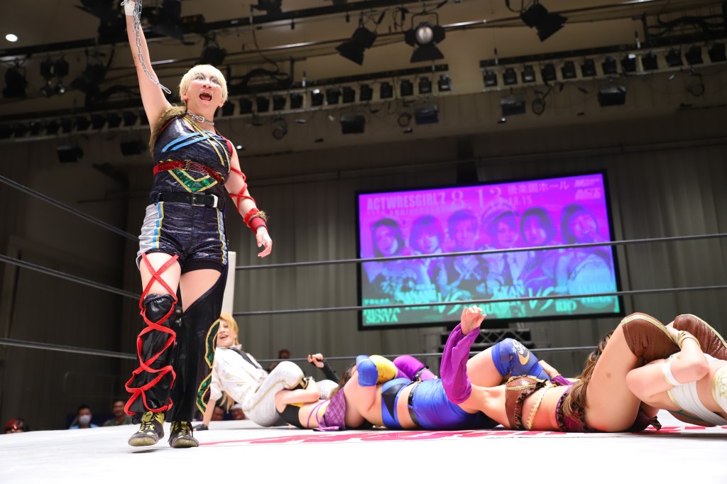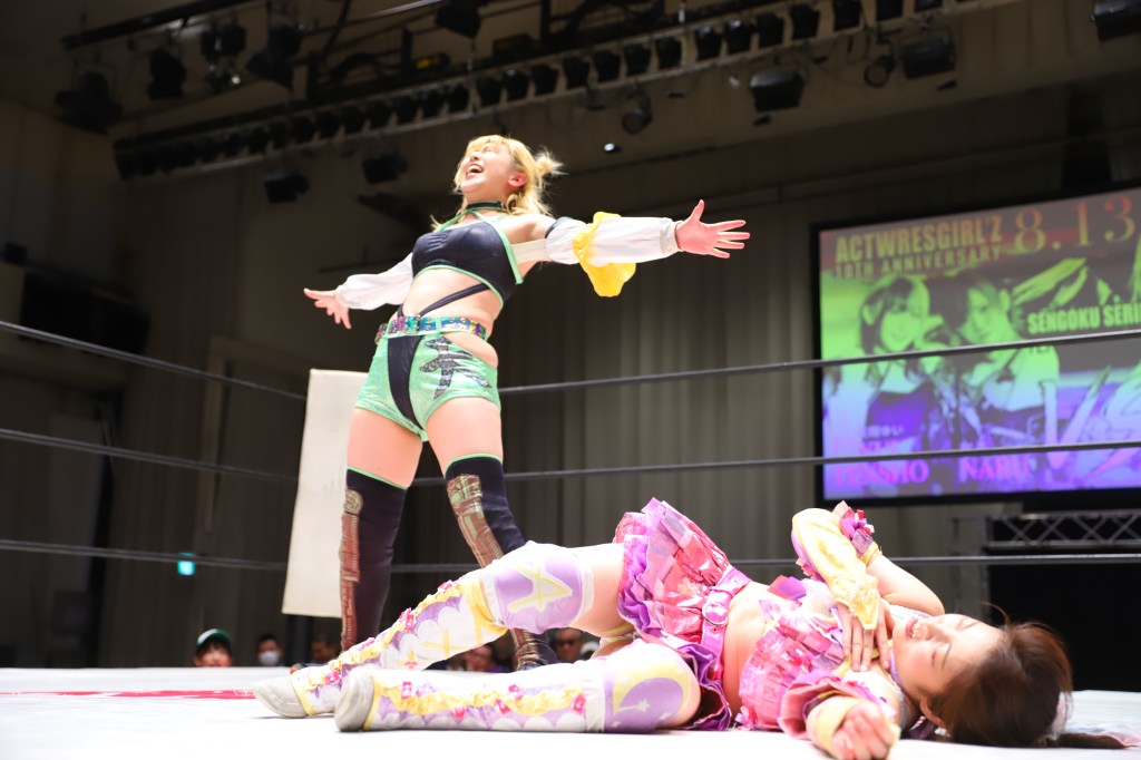 The big summer run for Actwres girl’Z culminated at Korakuen Hall on August 13 with one of the most significant shows in company history as they celebrated their 10th anniversary. The finals of ACT Game decided who the inaugural tag champions would be; STARDOM’s Natsupoi and Saori Anou returned to their roots and wrestled in an AWG ring once again, Mizushima took on Nagisa for the King of Entertainment, and Polaris☆ had a chance to shine brightly.