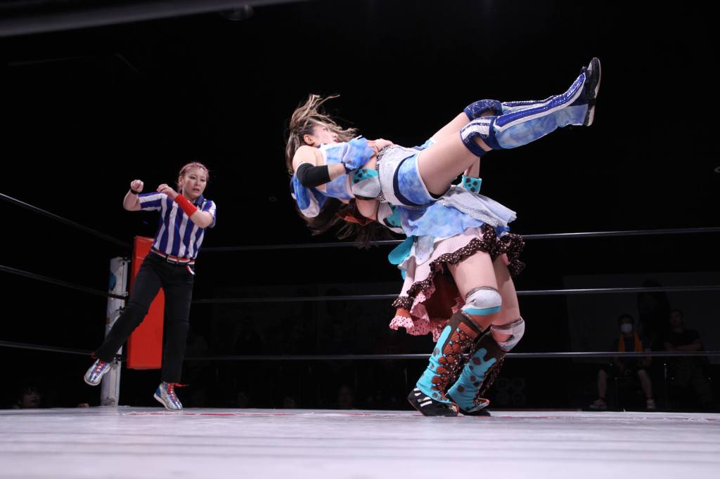 Great chemistry between these two, and they are both advancing at similar paces now. Aoba keeps incorporating ground work into her arsenal and Rico is becoming one of the firecrest kickers in a company that is historically known for hard kickers. Chii picked up the victory with a backdrop hold.